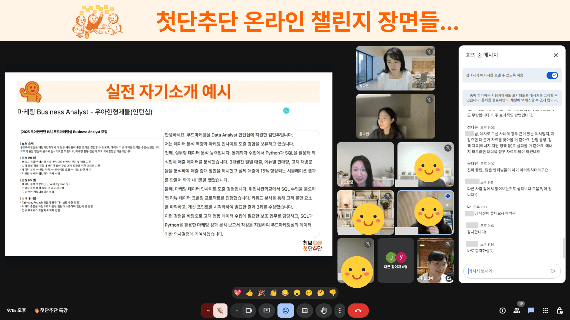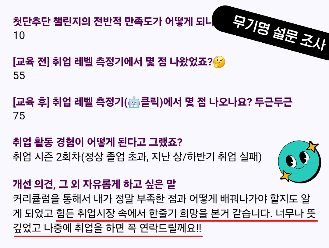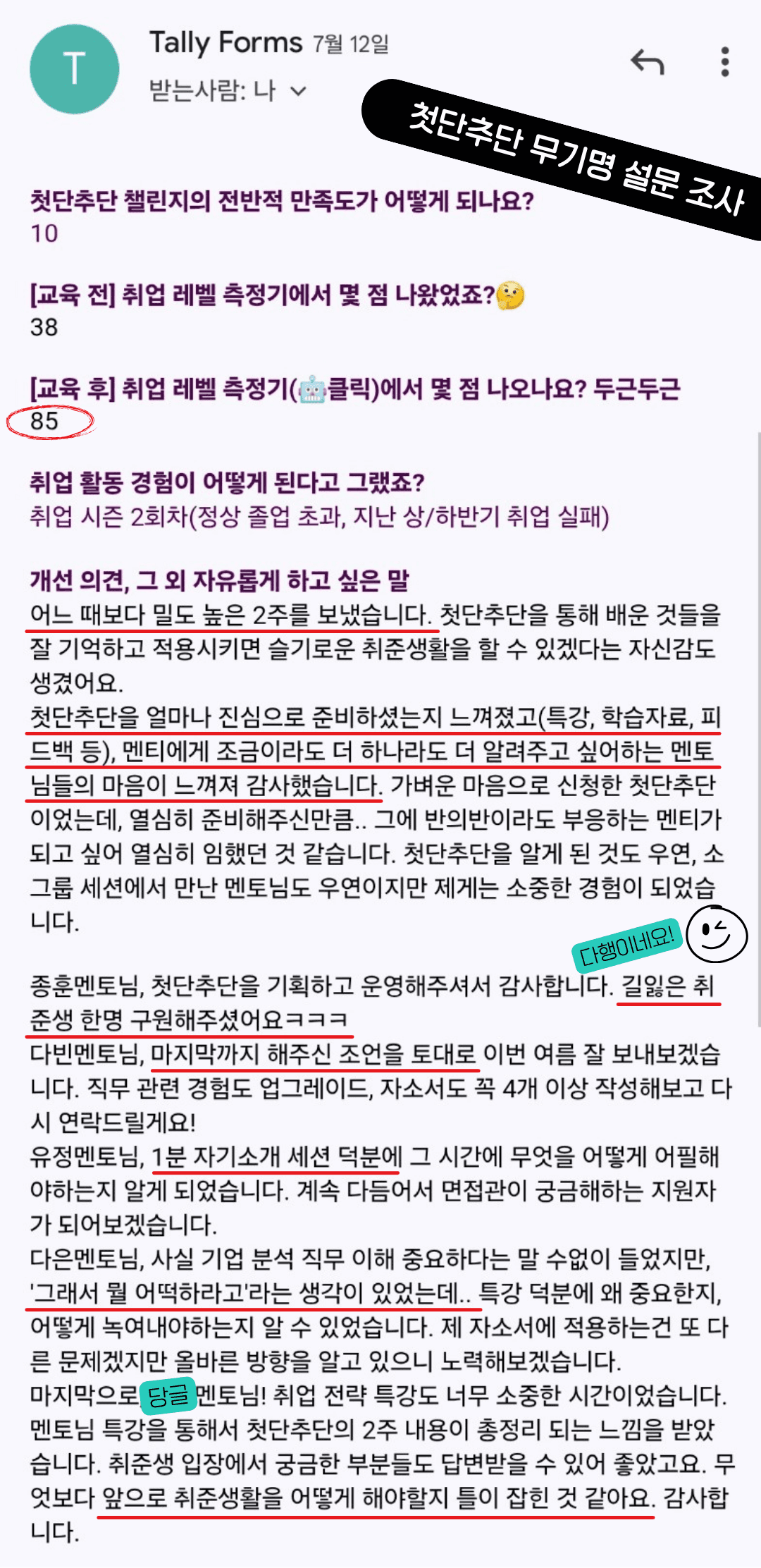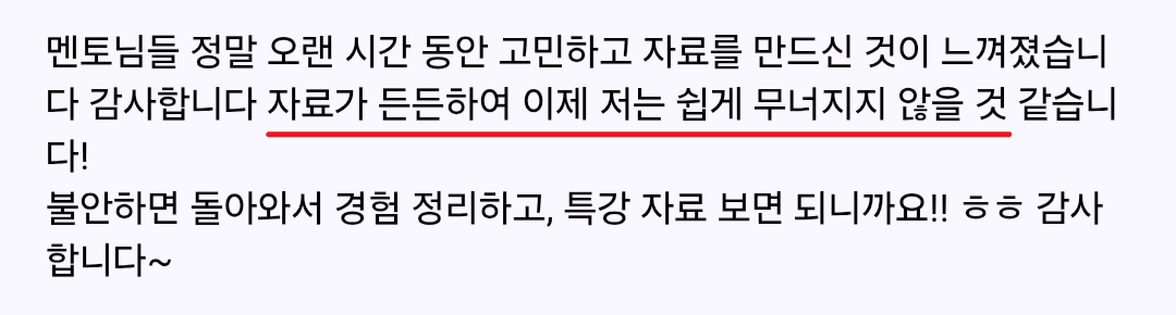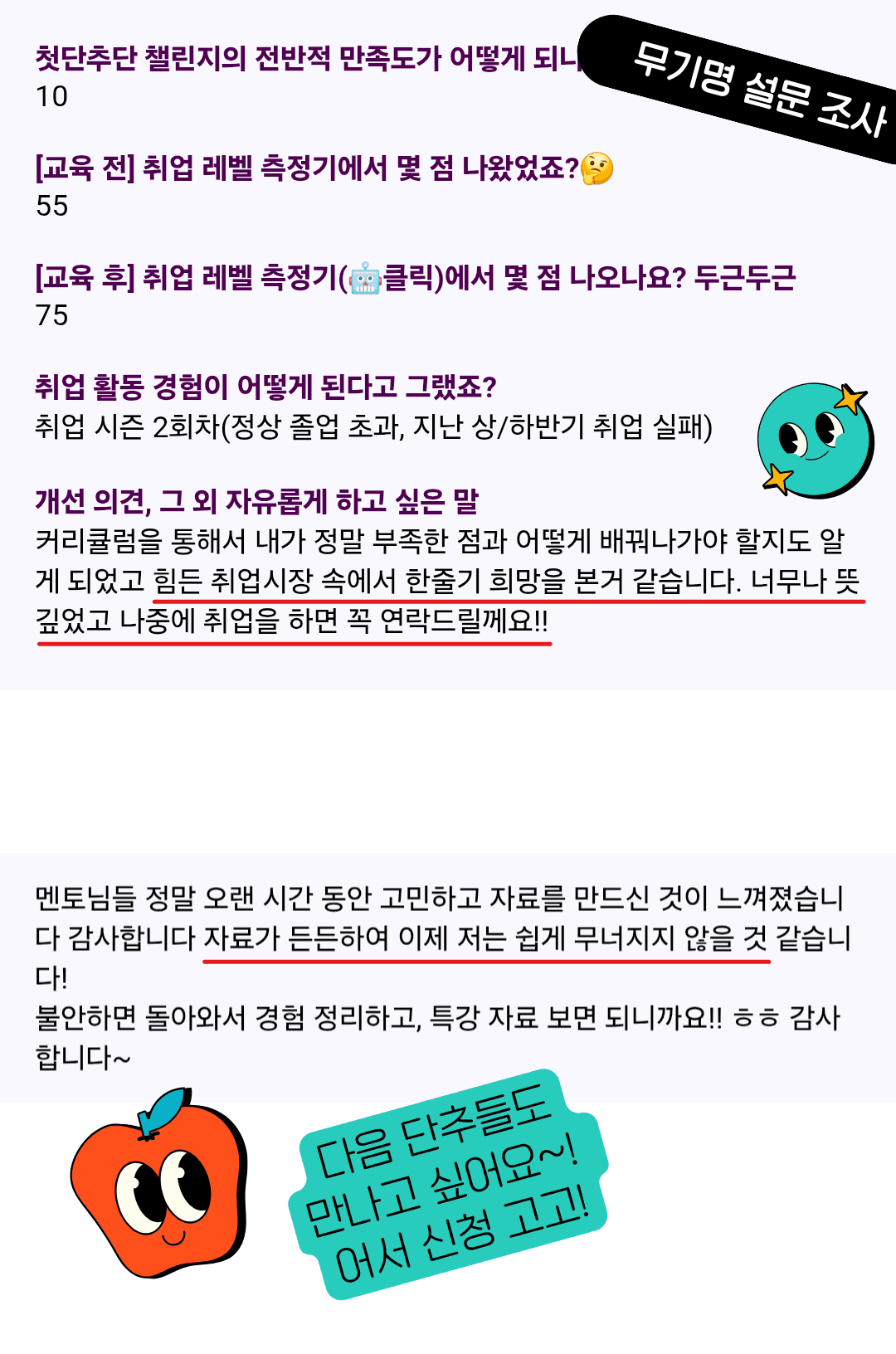저는 회사 경력도 있고, 다른 곳에서 취업 상담 프로그램도 종종 이용해 봤는데요. ⭐첫단추단은 확실히 다릅니다. 실력 있는 검증된 멘토님들로부터 제대로 된 코칭을 받을 수 있었습니다. 무엇보다도 이제는 자소서와 면접에서 어떤 것을 어필해야 할 지 확실히 알게 된 것이 가장 큰 성취입니다!