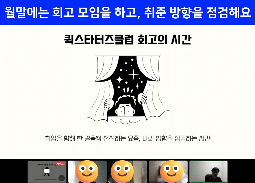 - 이런 접근이 취업 여정에 도움이 됩니다! 취업 부트캠프 운영 경험자로서의 확신인데요. 동료들의 취업 활동 현황을 보며 자극받고, 스스로 게을러지는 걸 막아주기도 해요.