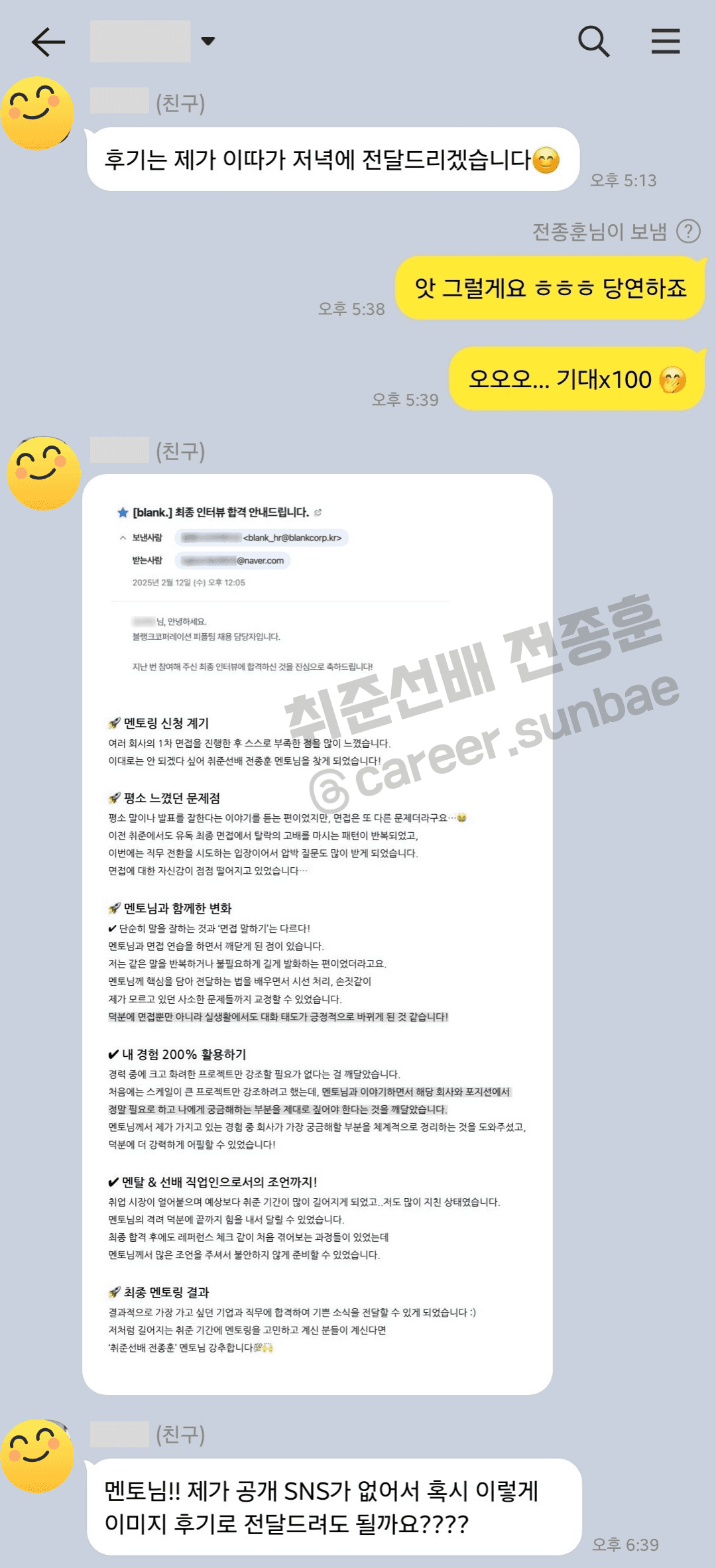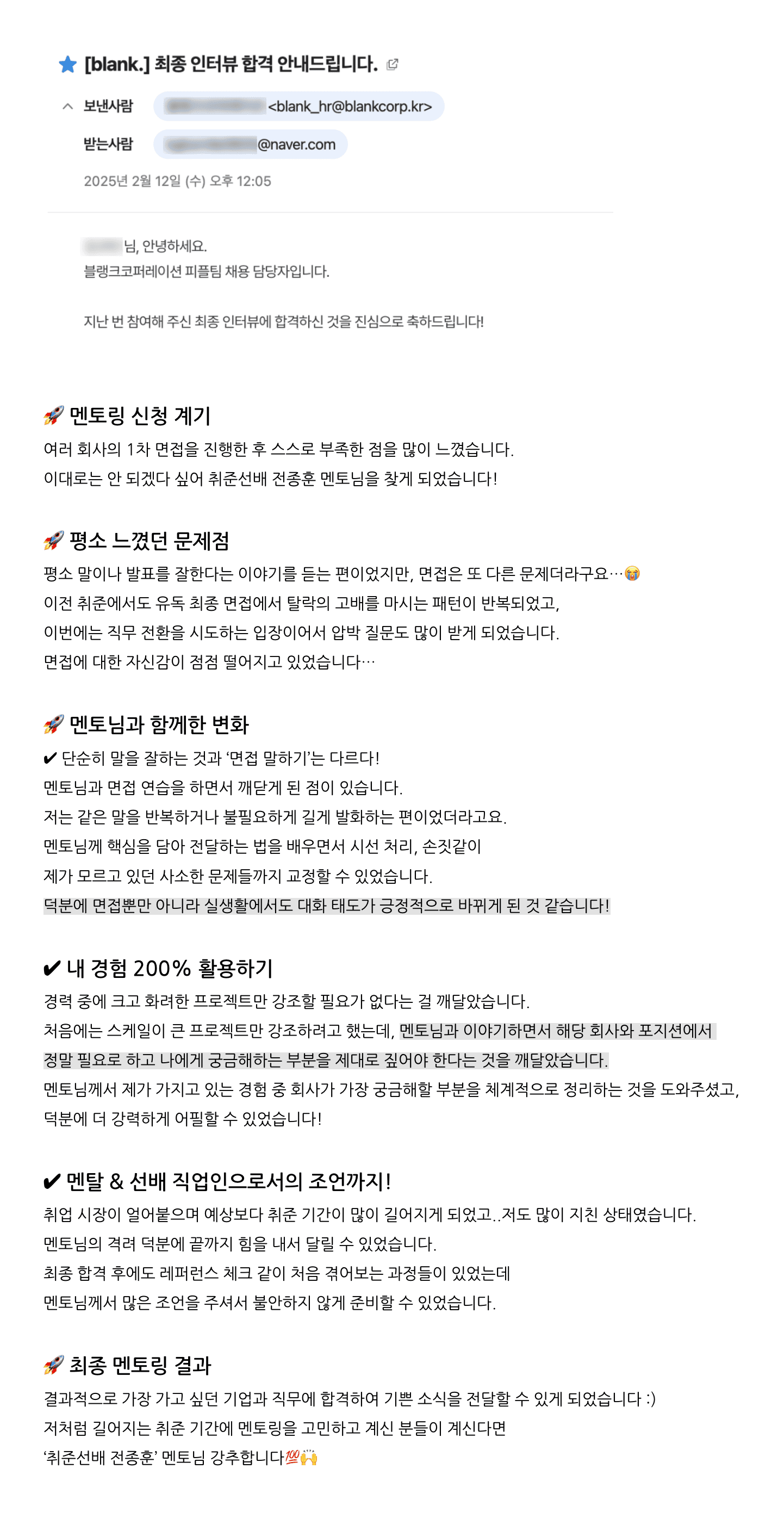 "많이 지친 상태였습니다… 덕분에 끝까지 힘 내서 달릴 수 있었습니다… 최종 합격 후에도 많은 조언을 주셔서 불안하지 않았습니다!"