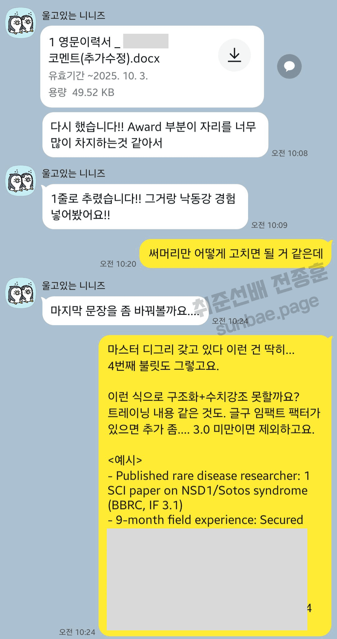 사실 하반기에 맡은 멘티가 많고, 일정도 바빠서 힘들었는데요. 사정이 사정인 만큼, 그리고 인연이 깊은 만큼 거절할 수 없었죠. 제가 더 고생해서 빨리 취업시키기로 결심했어요. (그래서 제가 하반기에 결국 응급실에 실려간…🙃)