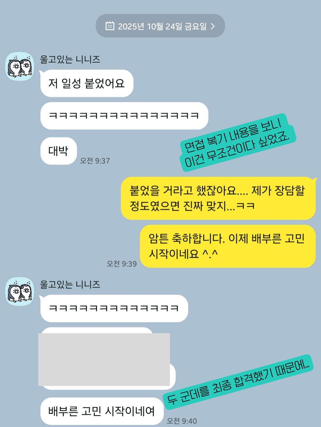 첫 직장 입사 후에도 저와 종종 연락하며 지냈어요. 그런데 어느날 갑자기 퇴사하겠다고 전화왔을 때는 '헉 지금 퇴사하면 취업 힘든데' 생각이 들어서 말렸어요. 퇴사하지 말라고… 다니면서 이직하자고요.