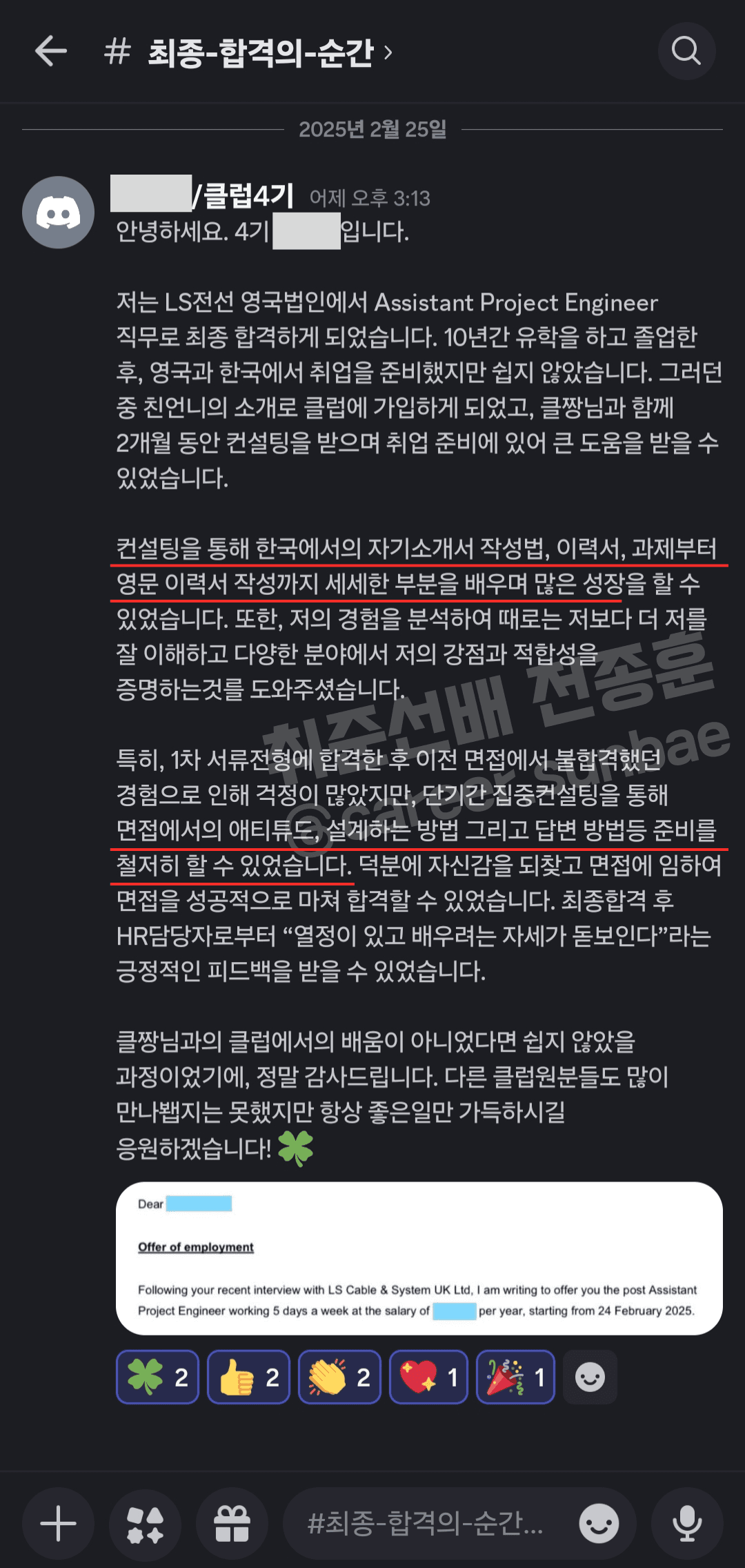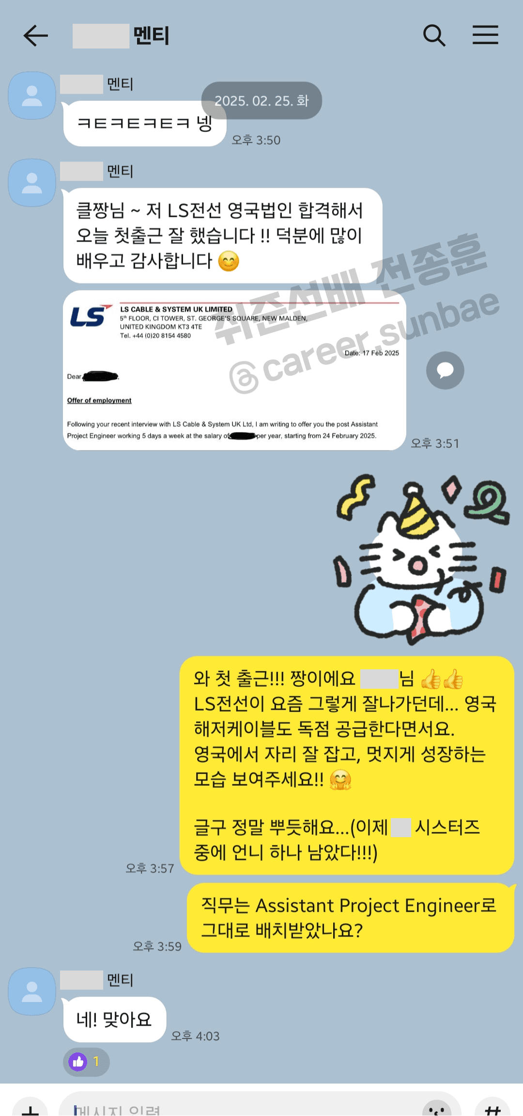 AI & 전기화 트렌드에 따라 에너지의 생산과 그 공급이 정말 중요한 요즘이죠. 이와 관련해서 LS전선이 정말 잘나가는 회사라고 생각해요! 특히 HVDC 케이블 분야에서 세계적인 경쟁력을 보유하고 있죠. 영국에서는 해저케이블 독점 공급한다고 들었고요. 이런 회사의 영국 법인에서 근무하는, Assistant Project Engineer 직무에 제 멘티가 최종 합격했답니다. 🤩