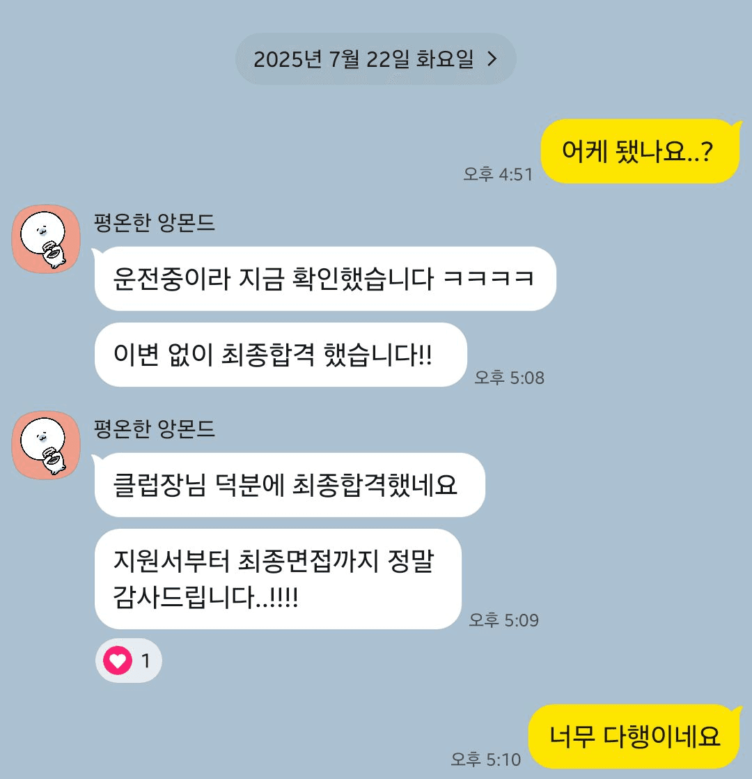 저를 알게 되어 컨설팅 받은 게 "인생 최고의 투자"라고 하시는 분인데요. 그 이유는, 저와 3개월 함께 하며 "NH투자증권", "포스코" 두 곳에 최종 합격했기 때문입니다. 이 정도면 최고의 투자 맞죠? 🥰 (진짜 뿌듯)