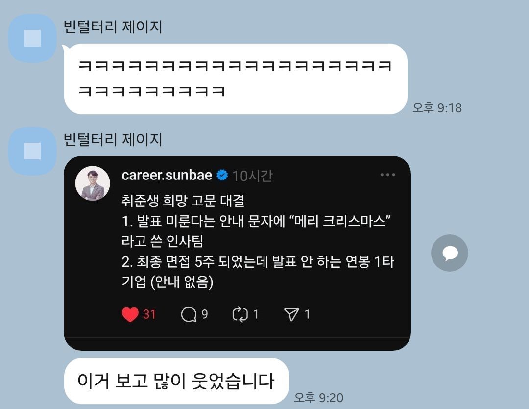 새해에도 영상 통화하고, 틈틈이 카톡하며 지낸다고요. 진짜 취준 멘토가 되어드렸다고 자부해요. (넘 친해졌다…😂)