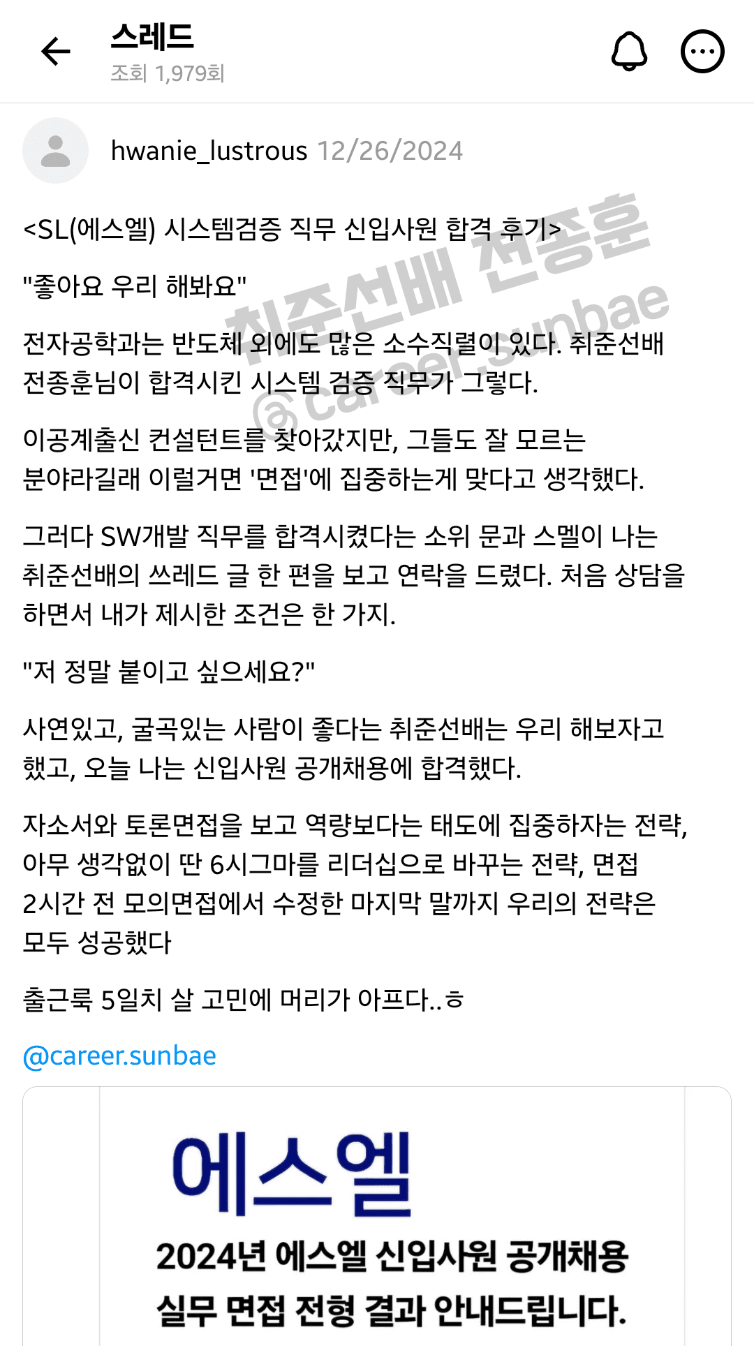 전자공학 전공하셨고요. 지원 직무는 "시스템 검증"이라는 희소한 직무였어요. 이공계 취업 멘토들도 잘 모르는 직무라고 자신 없어 했다고 해요. 그런데 저를 찾아오셨고, 저도 물론 해당 전공 분야의 테크니컬한 부분들은 스스로 채우셔야 한다고 말씀드렸죠.