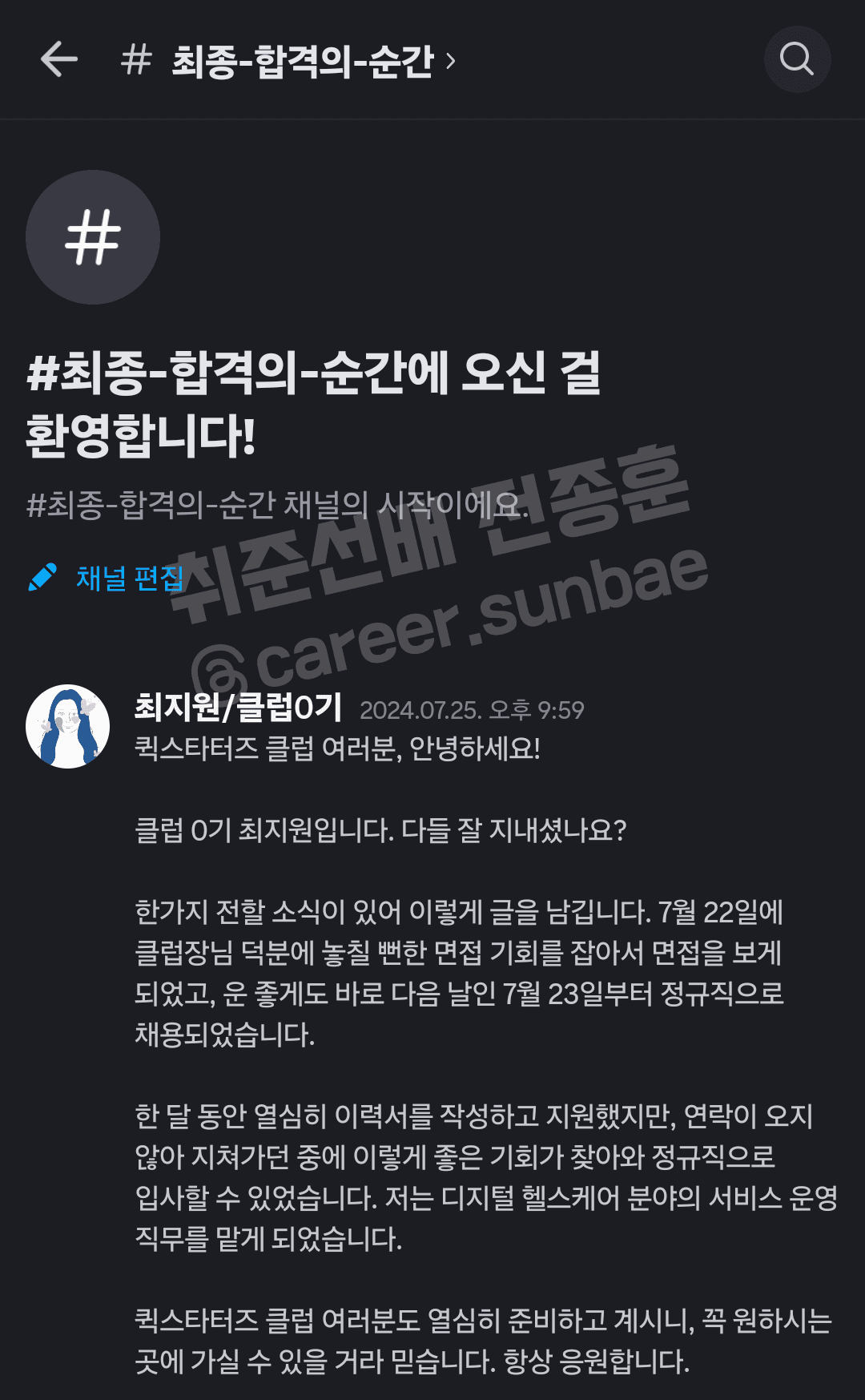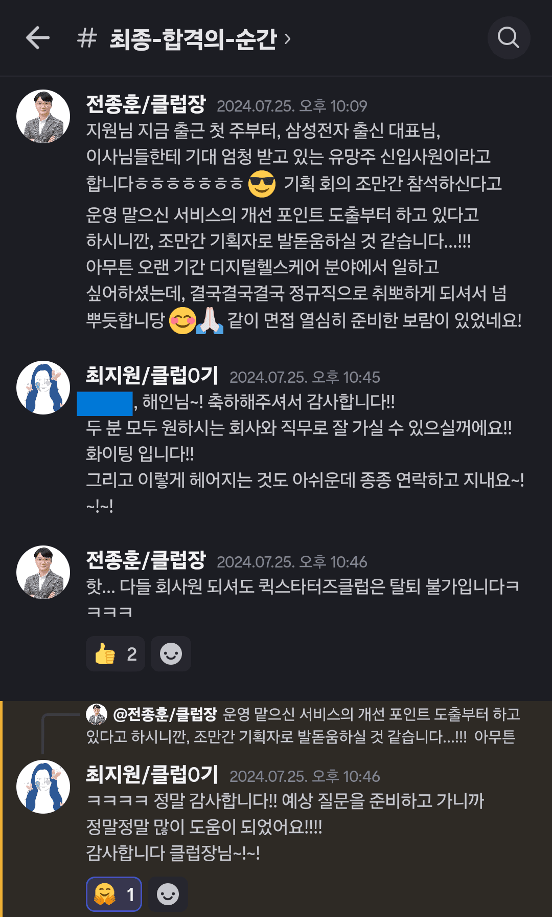 클럽 0기 멤버 지원님은요. 삼성전자 스핀오프 스타트업에 서비스 운영자로 최종 합격했어요.
