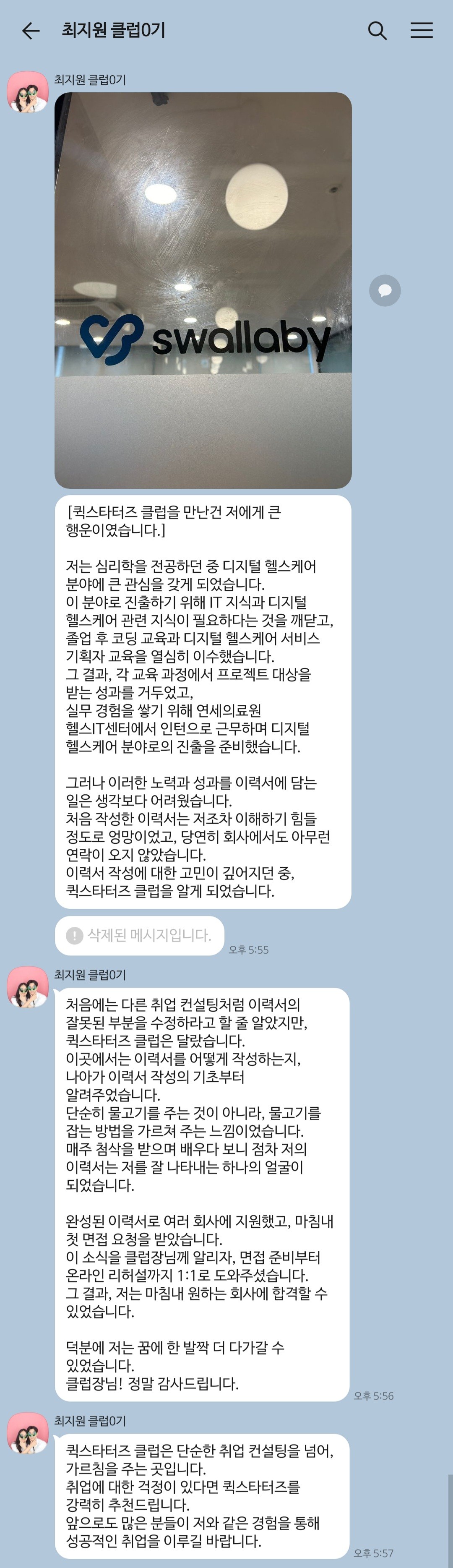 제가 운영한 컨설팅 멤버십(퀵스타터즈클럽)의 1호 취업자가 되신 분!